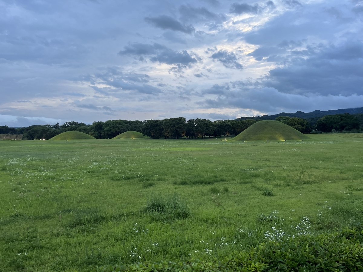 古墳いっぱい。ライトアップしてあって綺麗…なぜかバラード曲も流されている。観光客もいっぱい。居候「ライトアップはいいけどなんで韓国の観光地は音楽流したがるのかわかんない、邪魔!」(^ω^;;)