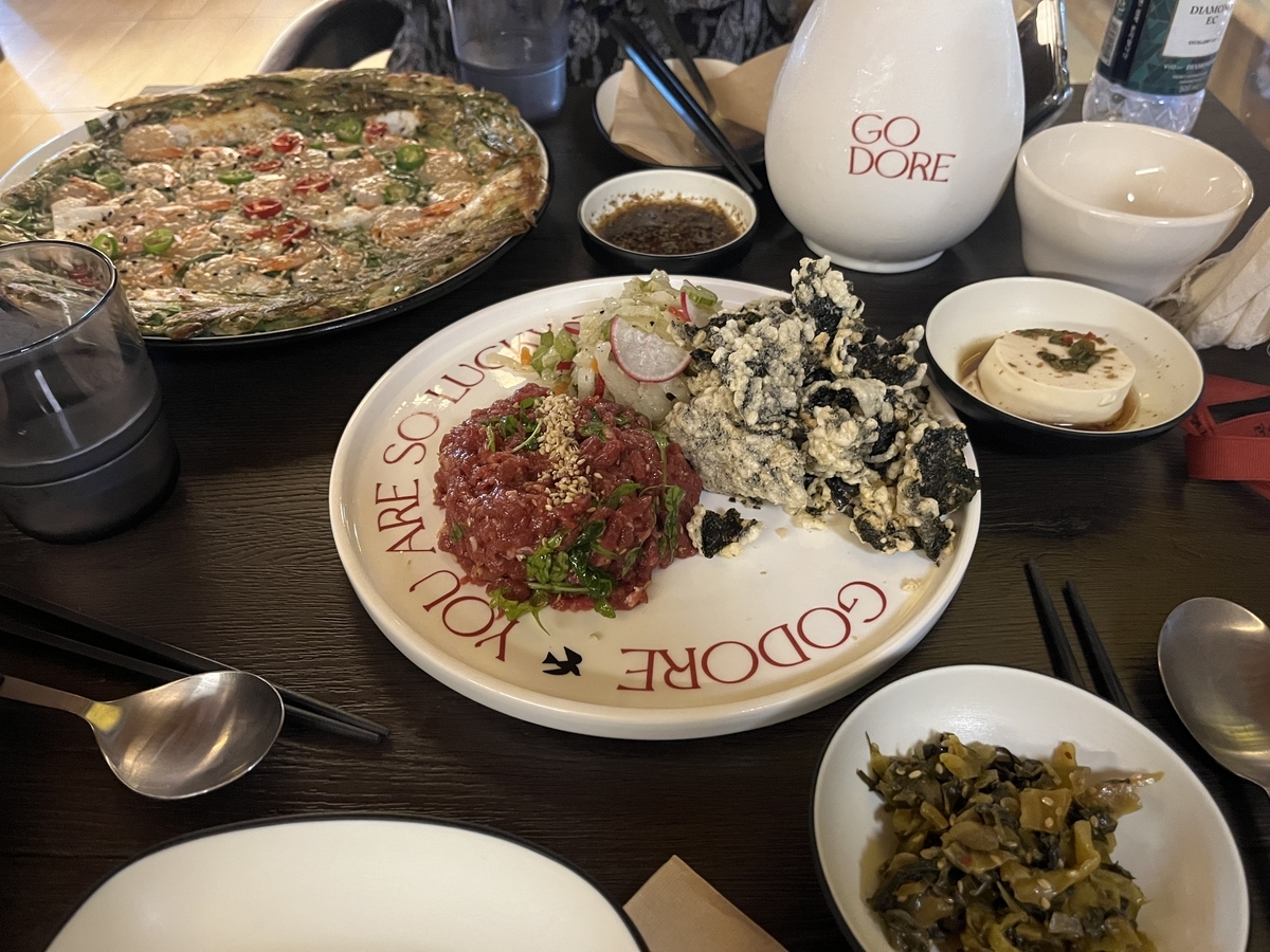 美味しいユッケと自家製マッコリ、海鮮チヂミを楽しみましたん。